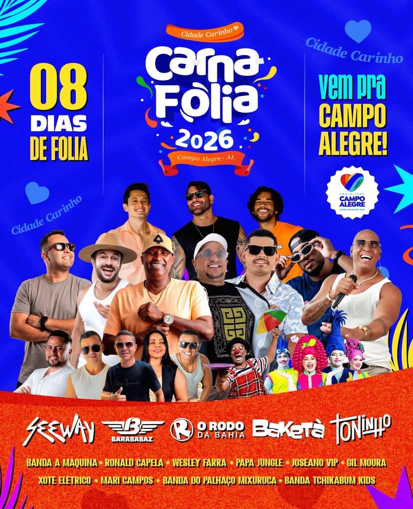 A Prefeitura de Campo Alegre divulgou oficialmente a programação do CarnaFolia 2026, que promete movimentar o município com uma série de eventos carnavalescos entre os dias 7 e 22 de fevereiro. Com atividades espalhadas pela sede e pelo distrito de Luziápolis, a festa reúne atrações musicais, blocos tradicionais, arrastões e matinês, consolidando o município como um dos destinos mais animados do carnaval alagoano.