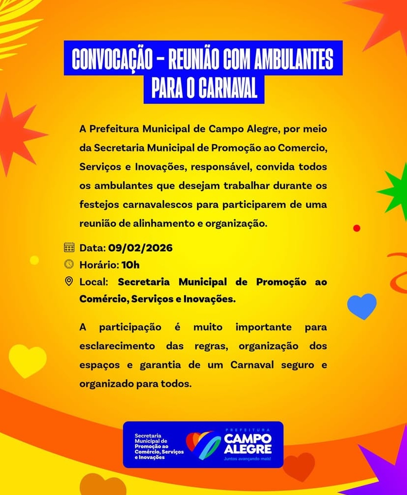 A Prefeitura de Campo Alegre, por meio da Secretaria Municipal de Promoção ao Comércio, Serviços e Inovações, convocou os ambulantes interessados em trabalhar durante o Carnaval para participarem de uma reunião de alinhamento e organização. A iniciativa tem como objetivo garantir que os festejos aconteçam de forma planejada, segura e dentro das normas estabelecidas pelo município.