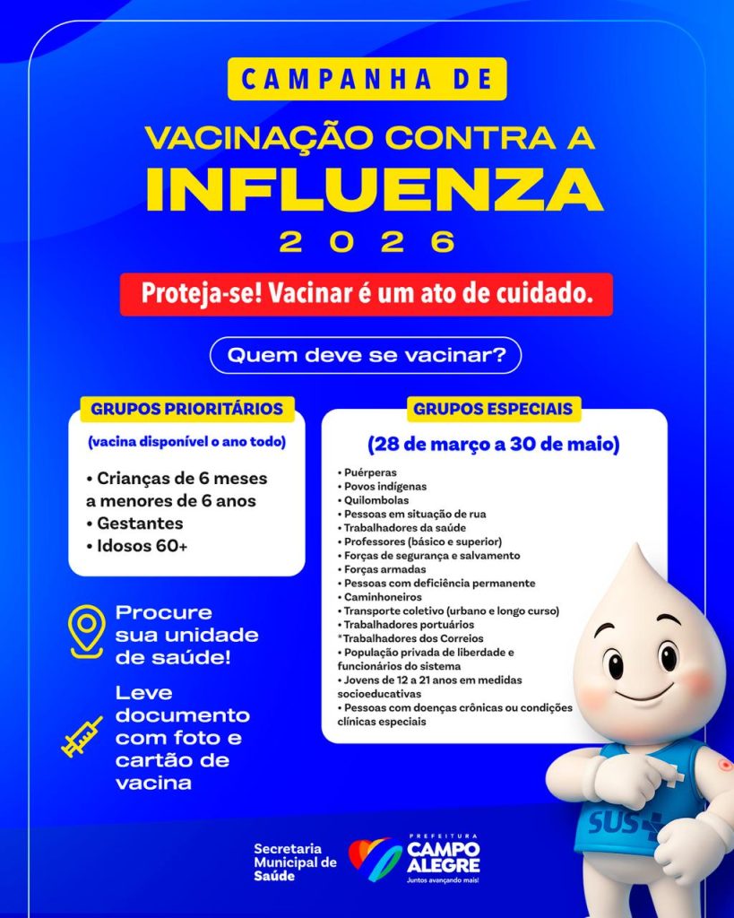 Nesta segunda-feira (30), a Prefeitura de Campo Alegre, por meio da Secretaria Municipal de Saúde, iniciou a estratégia de vacinação contra o vírus influenza em 2026. A Camonaha de vacinação teve inicio em todas as Unidades Básicas de Saúde (UBS) que já estão oferecendo o imunizante.